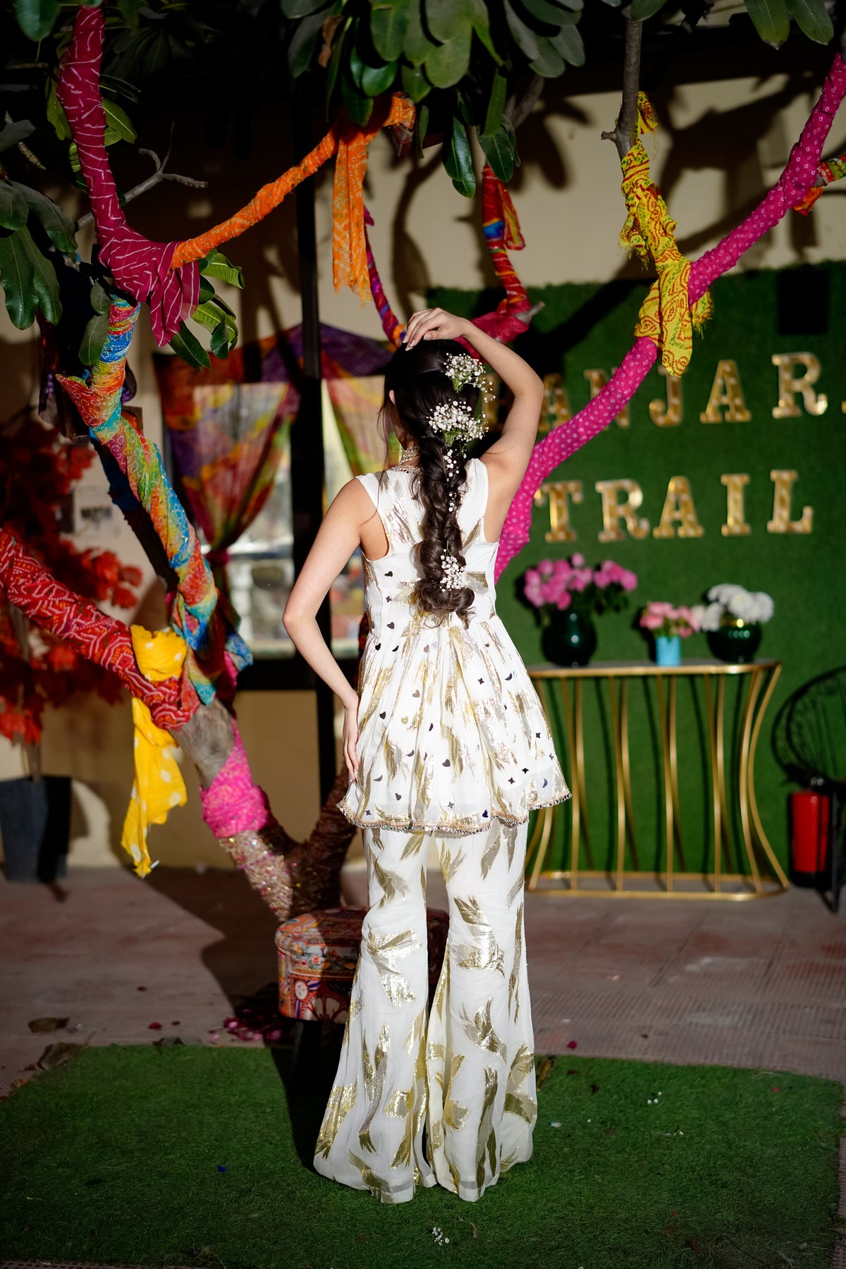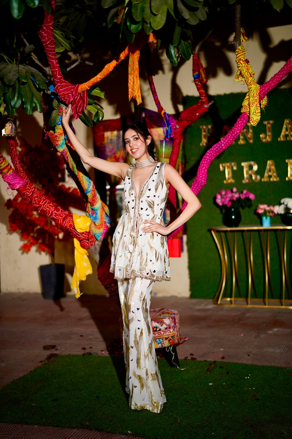 The sleeveless kurti features a flattering V-neckline, highlighted with delicate gold foil motifs and subtle hand embellishments that shimmer with movement. Paired with fluid flared pants adorned in matching celestial-inspired detailing, this ensemble balances modern ease with festive glamour. Finished with refined borders and a soft silhouette, Celestial is designed for women who prefer understated sparkle with a statement presence.