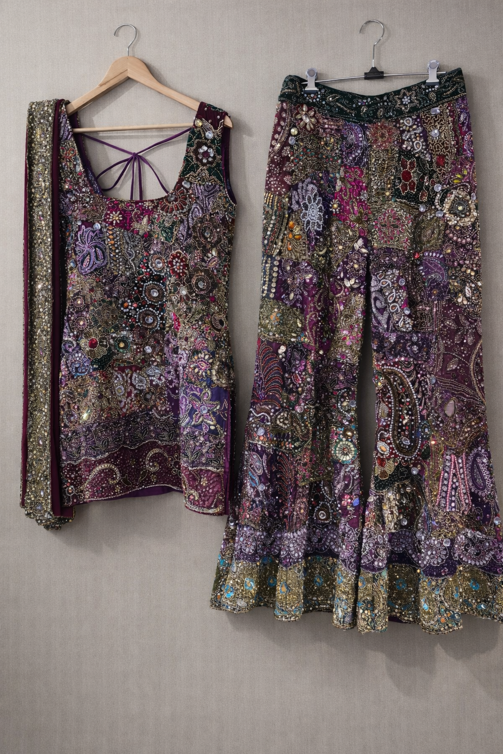 Bottom: Complementing flared sharara pants echo the grandeur with heavy zari and sequin detailing for maximum festive flair and graceful movement.