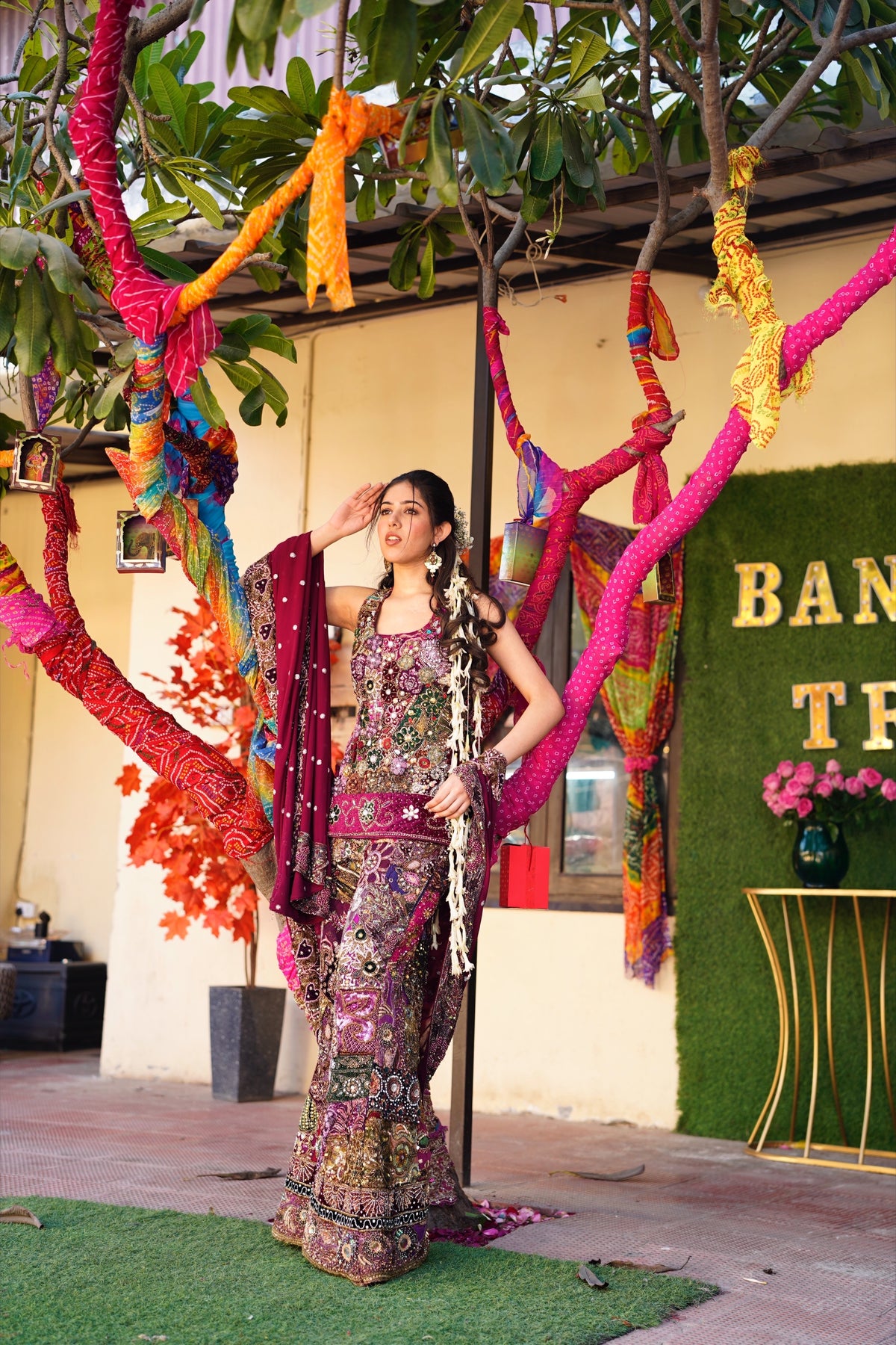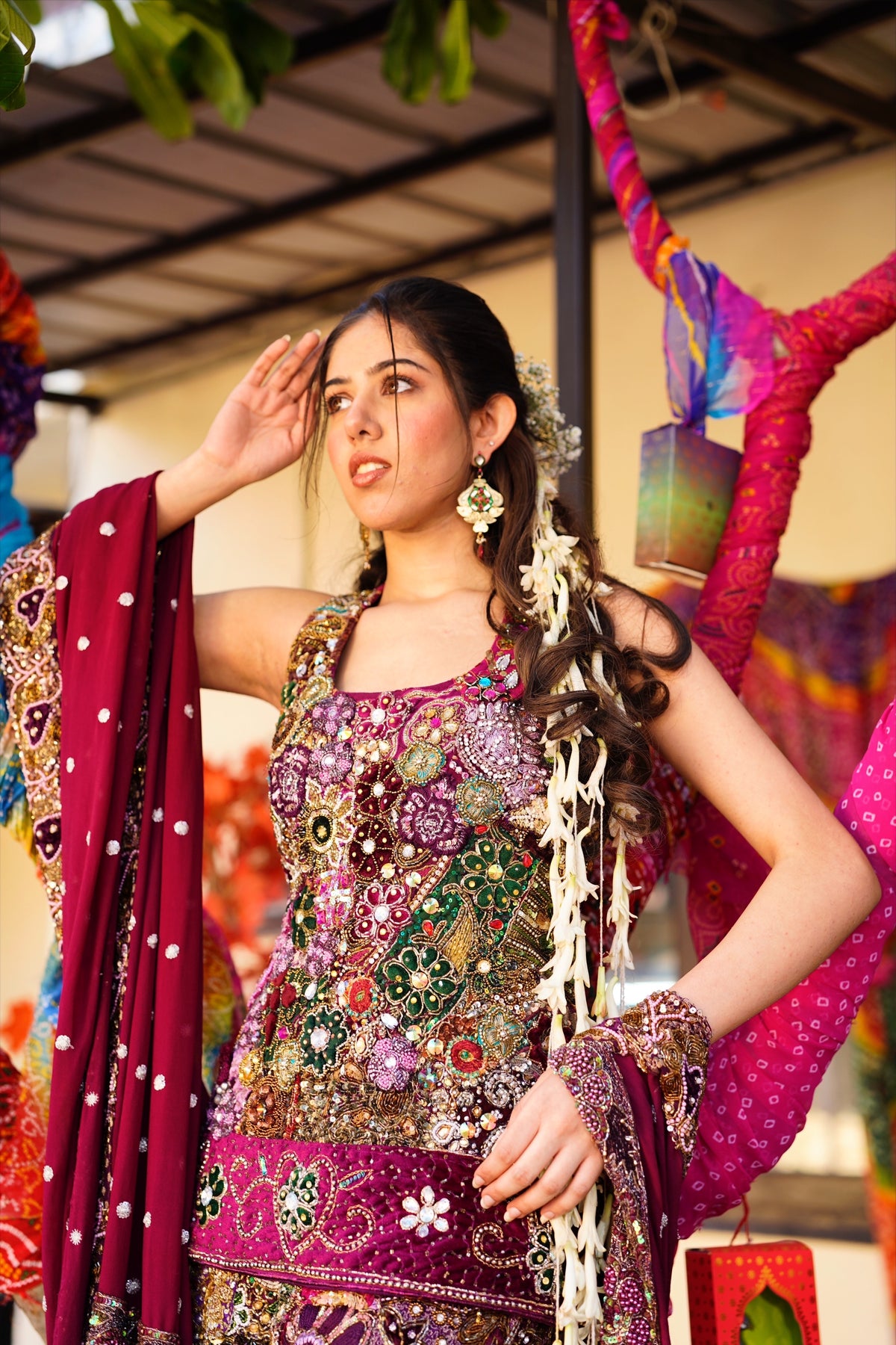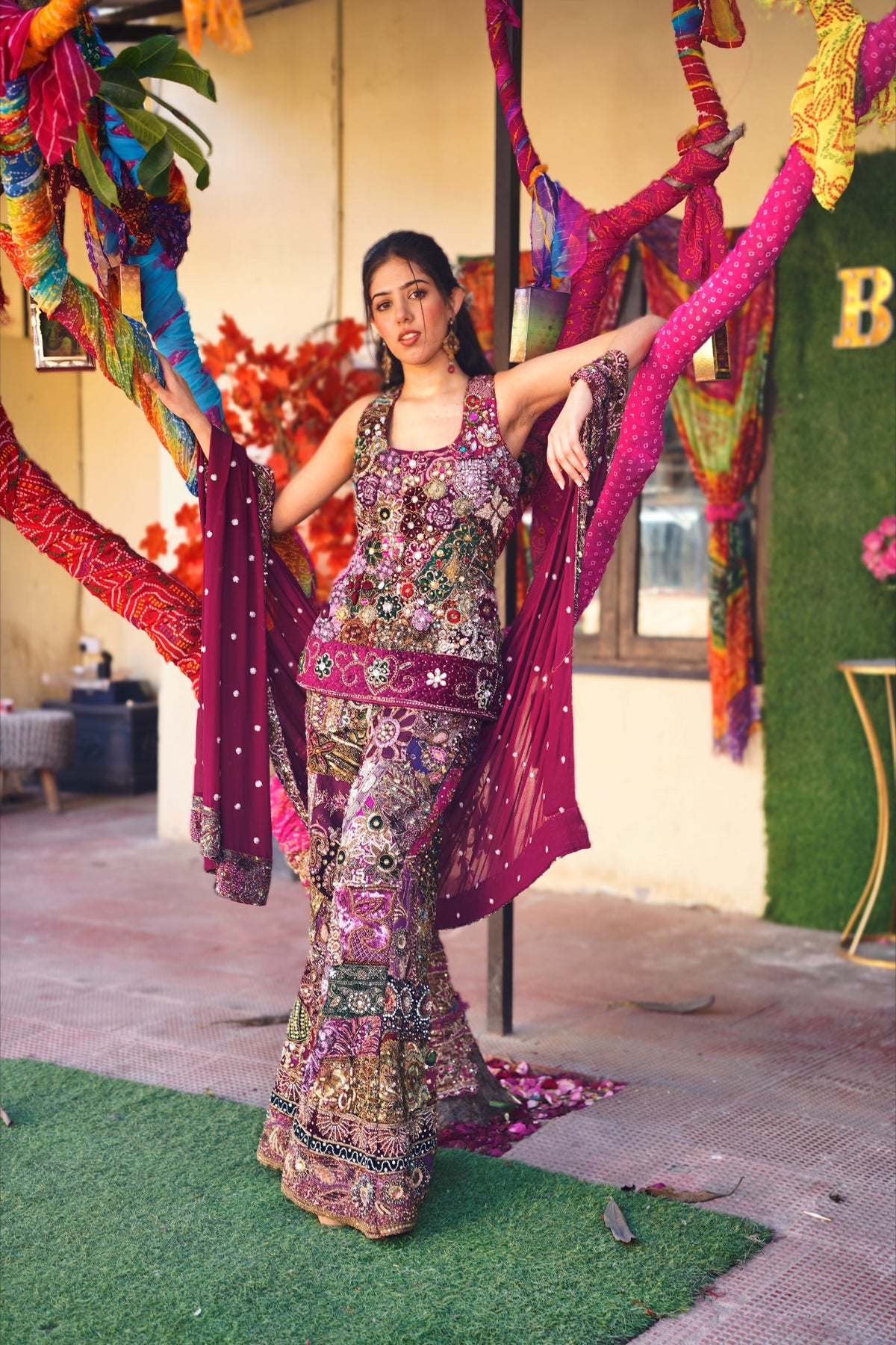 Royale Sharara Set a masterpiece designed for the modern maharani. Drenched in a rich rani magenta hue, this three-piece ensemble radiates celebration and craftsmanship.