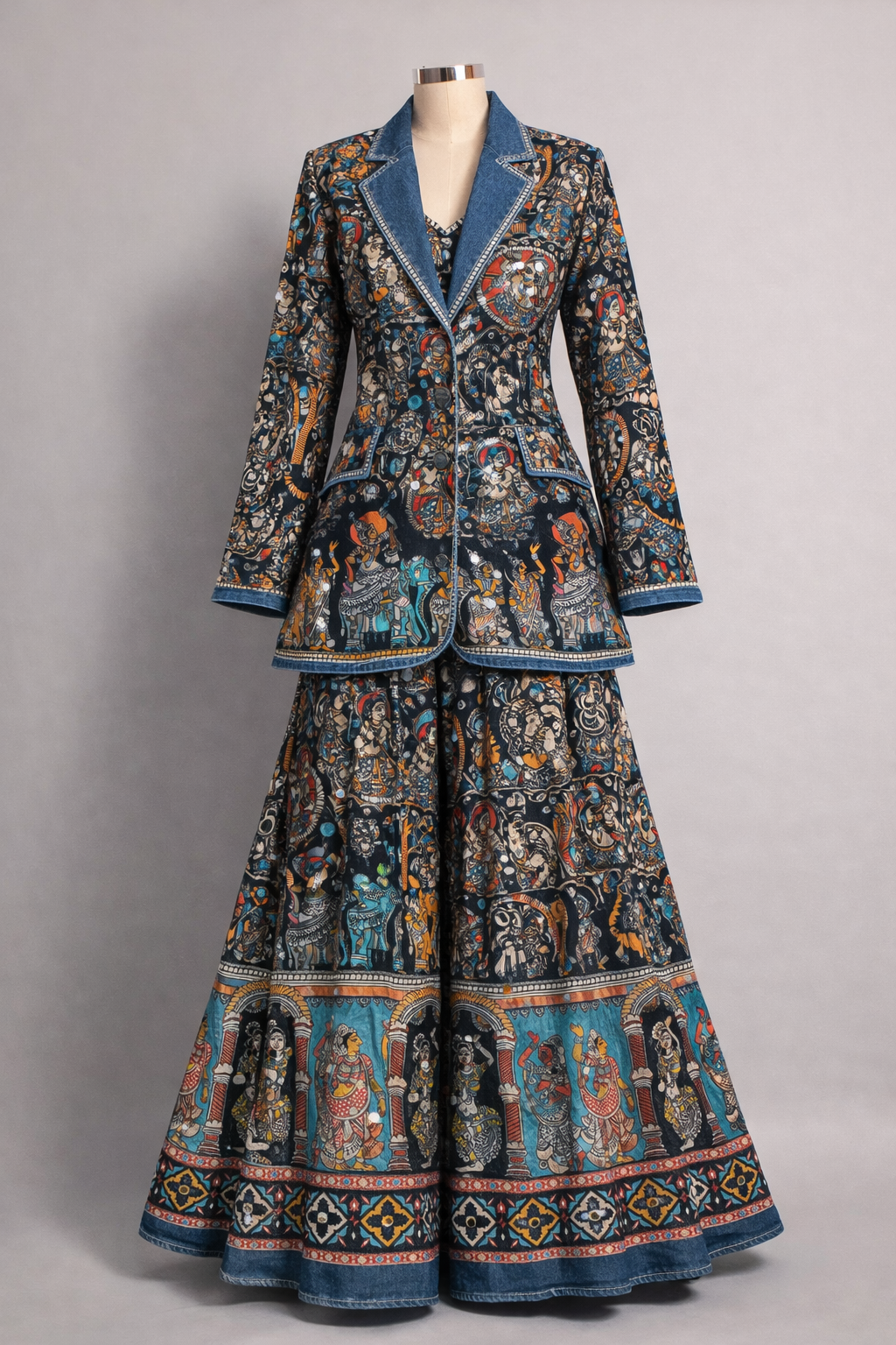 Crafted in fluid crepe, the set features a tailored blazer-style kurti paired with a voluminous sharara, blending sharp structure with dramatic movement. Denim detailing along the edges adds a contemporary contrast, grounding the heritage print in Banjara Trail's signature fusion aesthetic.
