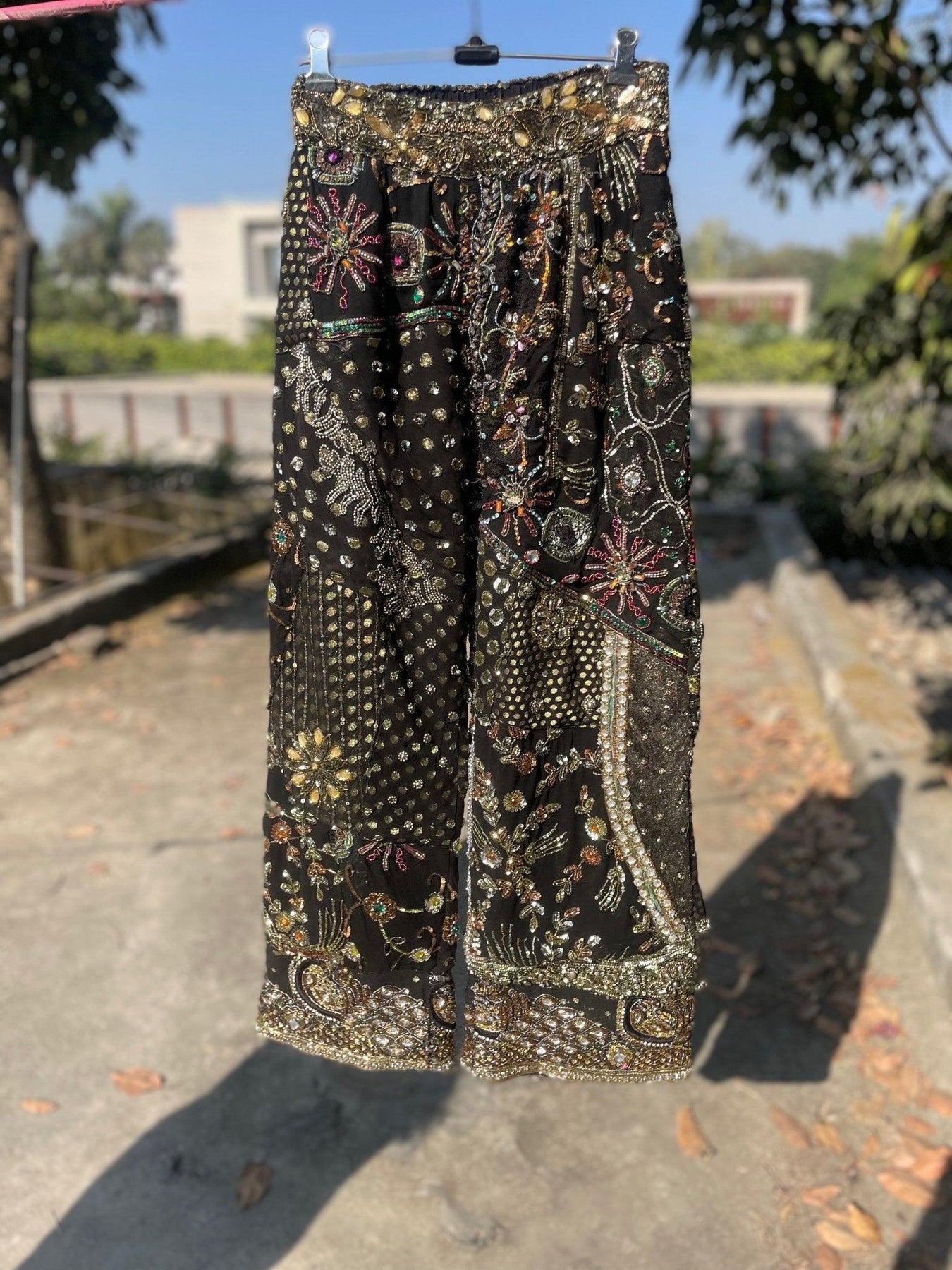 Become the center of attention with our one-of-a-kind handcrafted embellished pants, available in black and purple for any festive occasion. No one will have a pair like you. (Seriously, they're handcrafted)