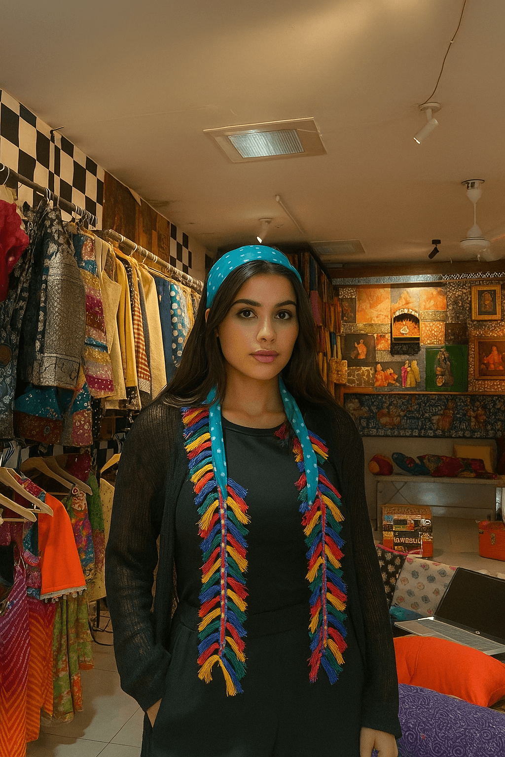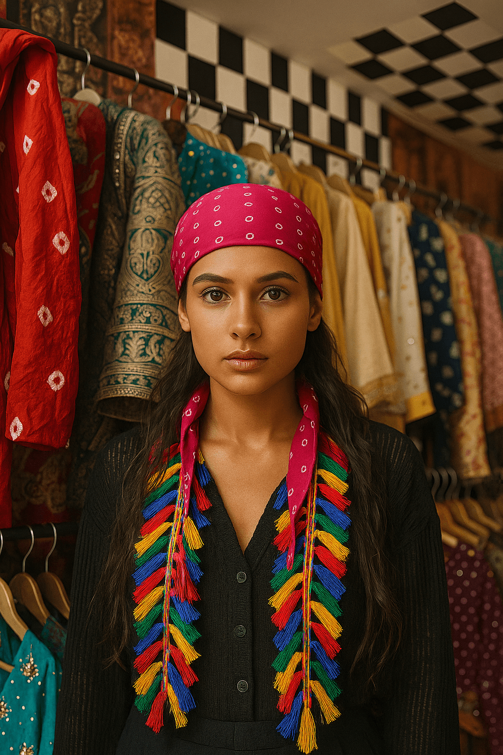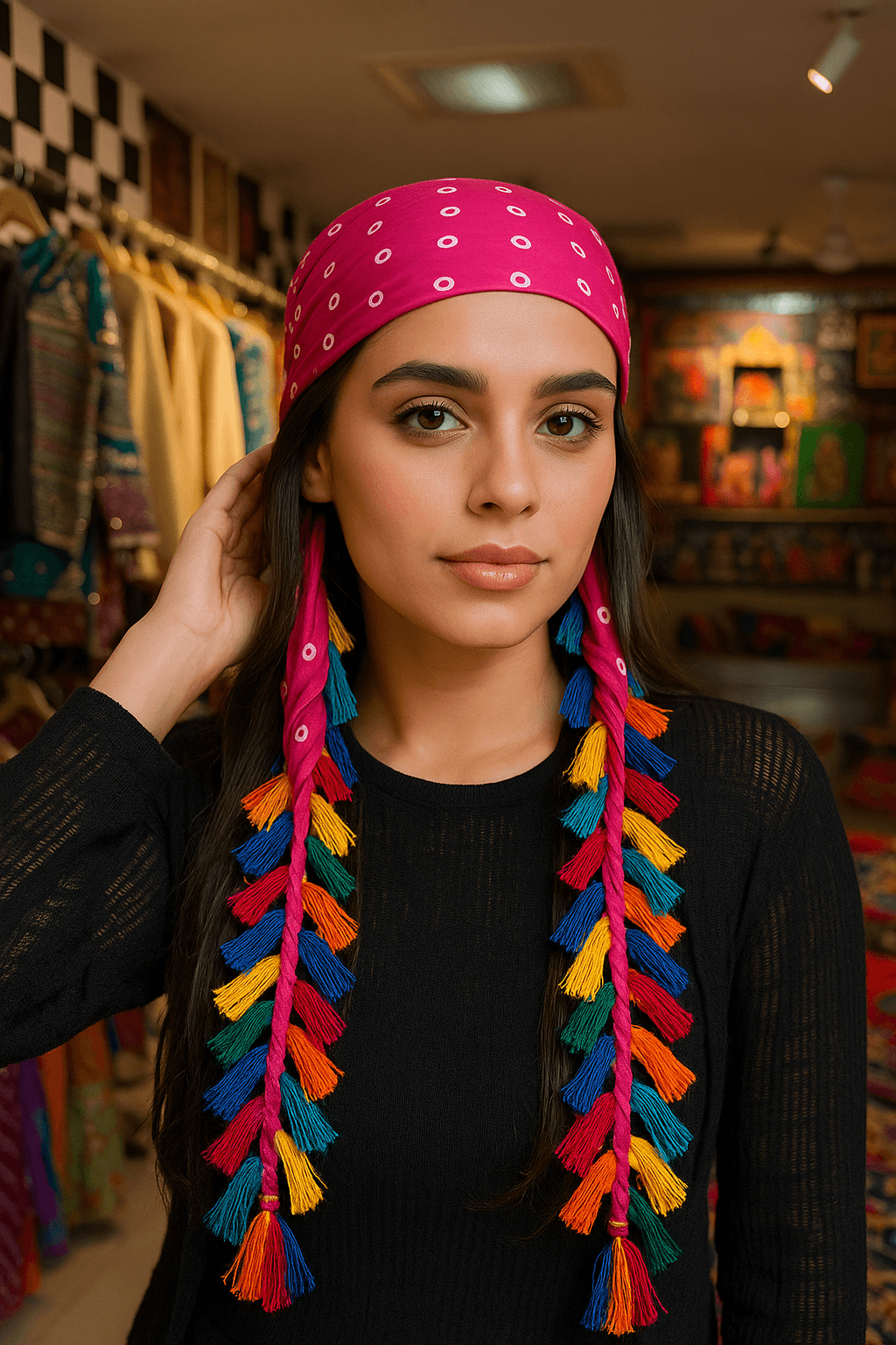 Turn heads with our handcrafted Boho Tassel Bandana a vibrant fusion of tradition and trend. Made from soft cotton fabric, this hot pink bandana features playful white dot accents and is finished with beautifully braided multicolor tassels for a bold, eye-catching look. Whether you‚¬„¢re dressing up for a festival, adding flair to your vacation outfit, or elevating everyday wear, this accessory brings effortless boho charm.