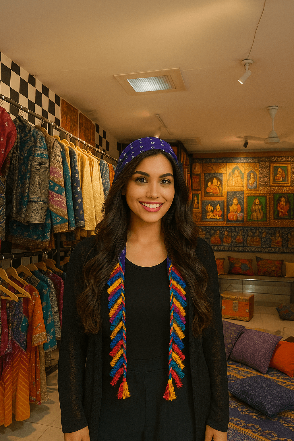 - Multicolor tassel braids: Yellow, Blue, Red, Orange, Green
