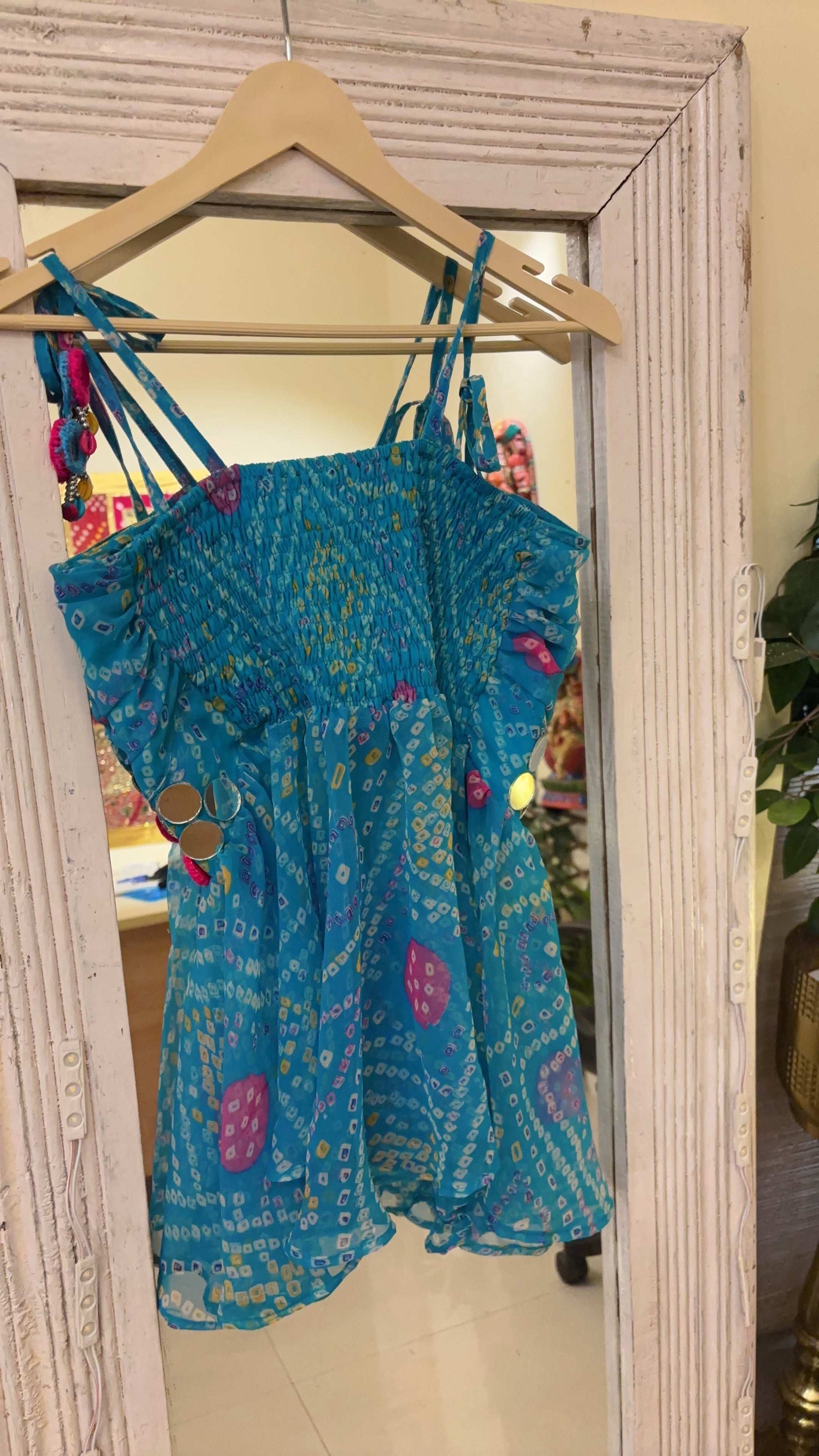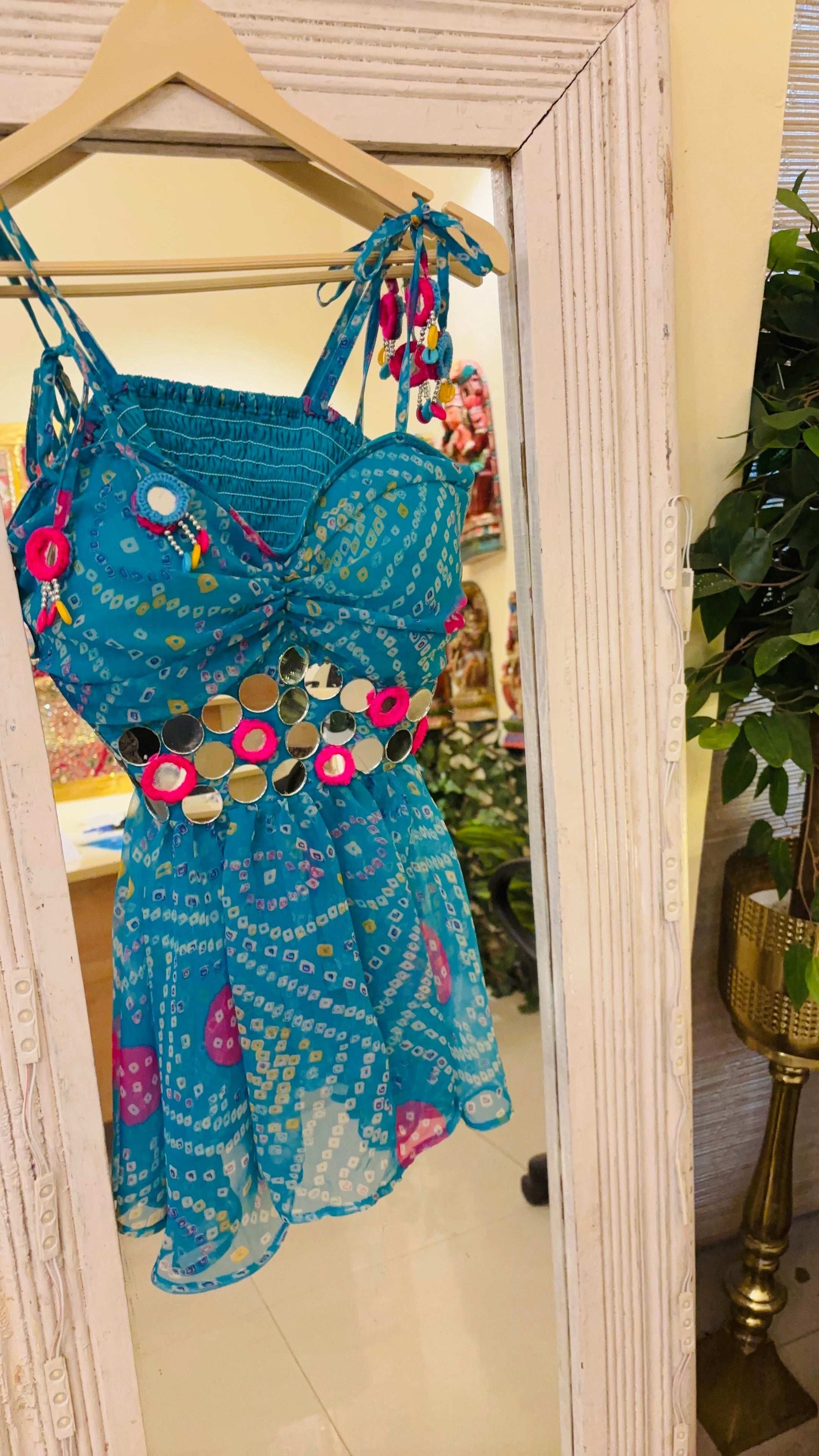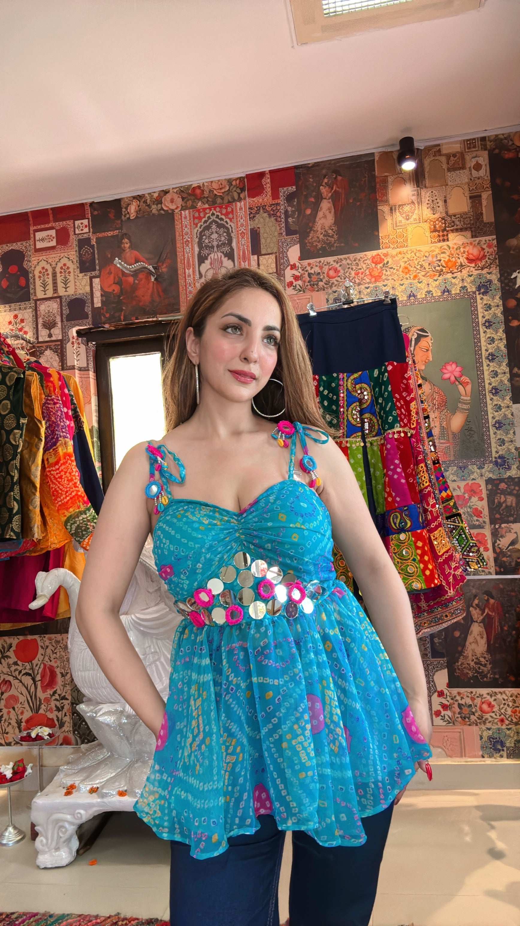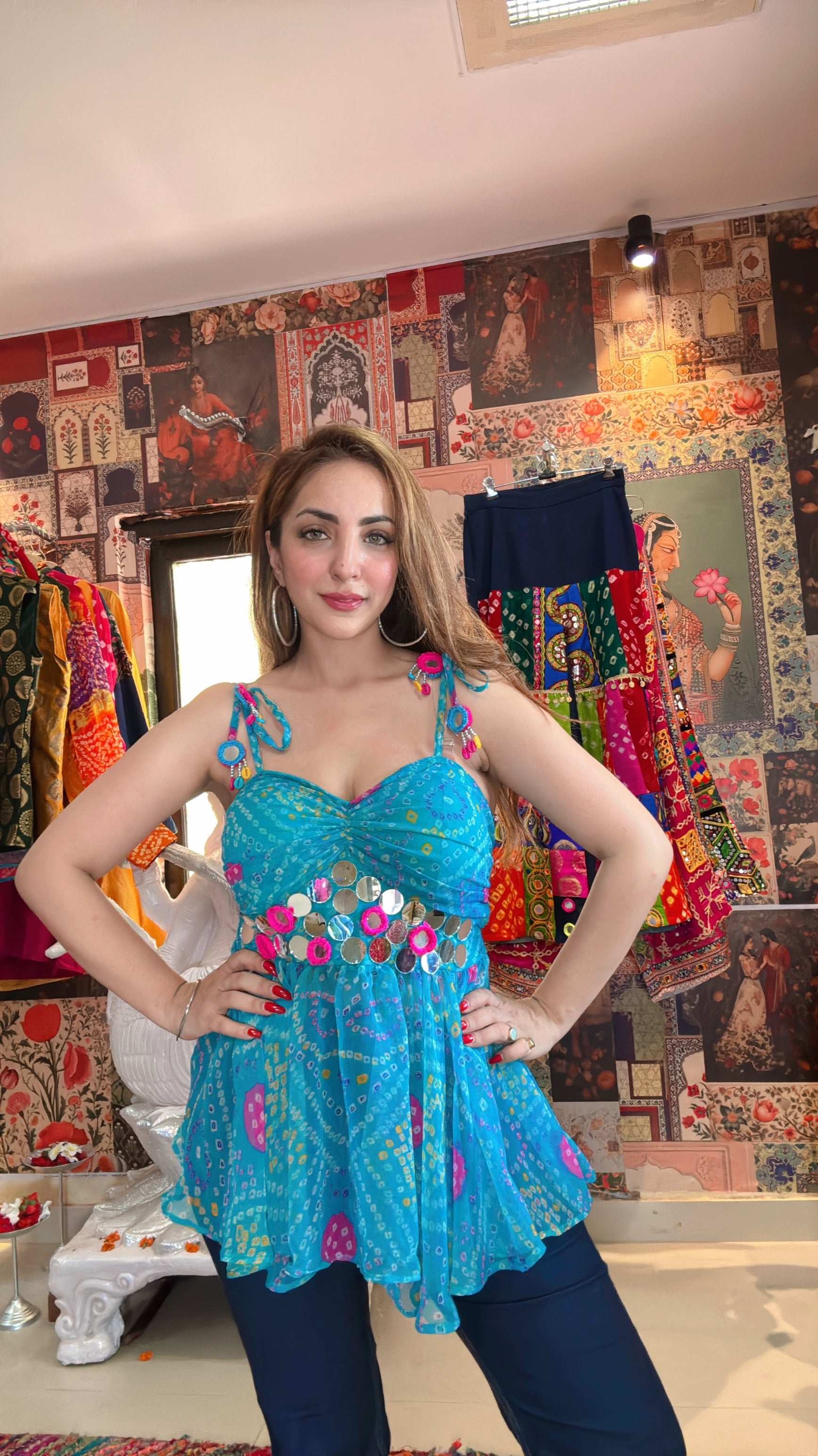 bralette-style top is a showstopper with bold mirror clusters, hand-crocheted details, and playful tassel beads. The elasticated back and adjustable straps ensure comfort while keeping it ultra-chic.