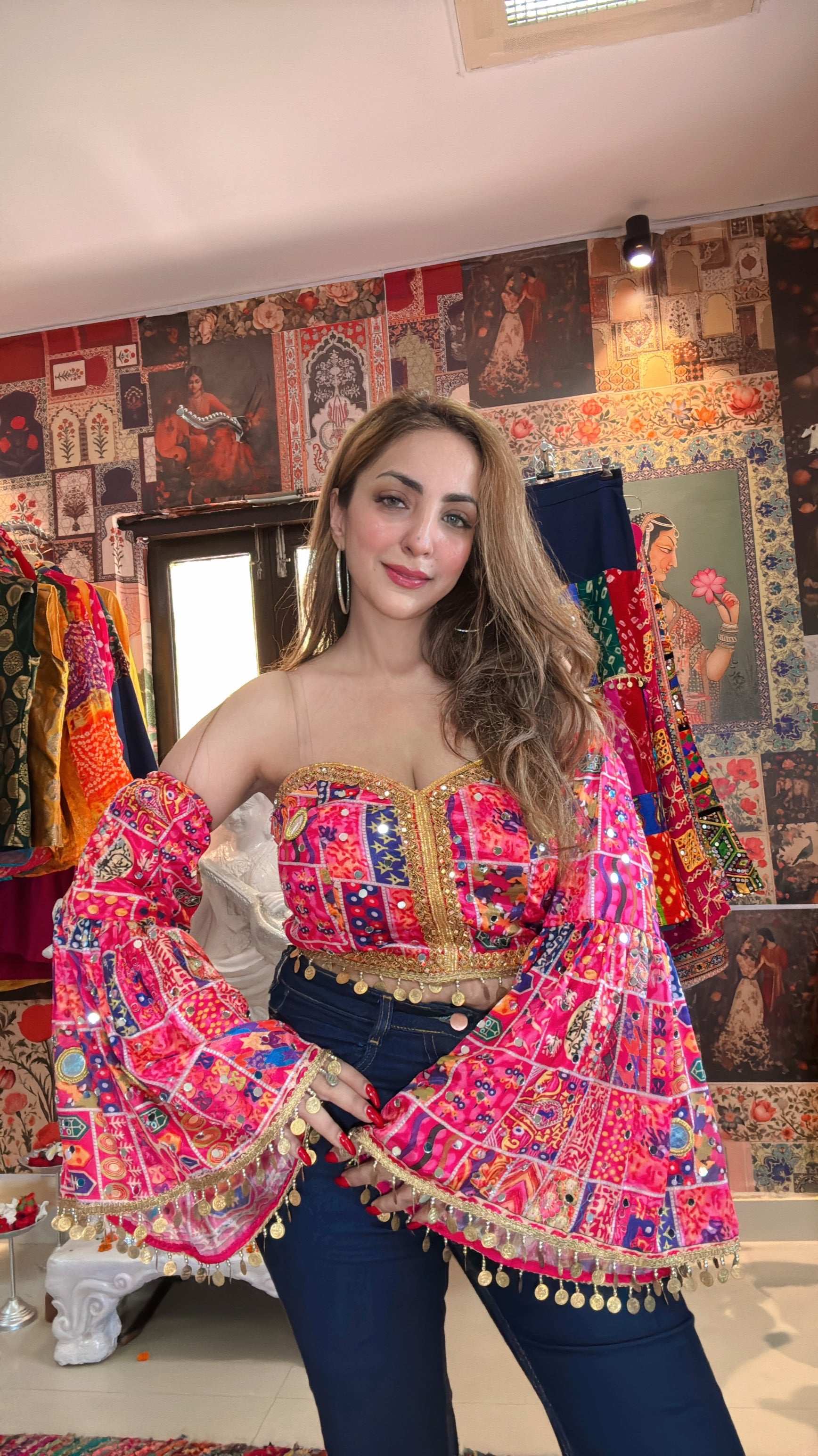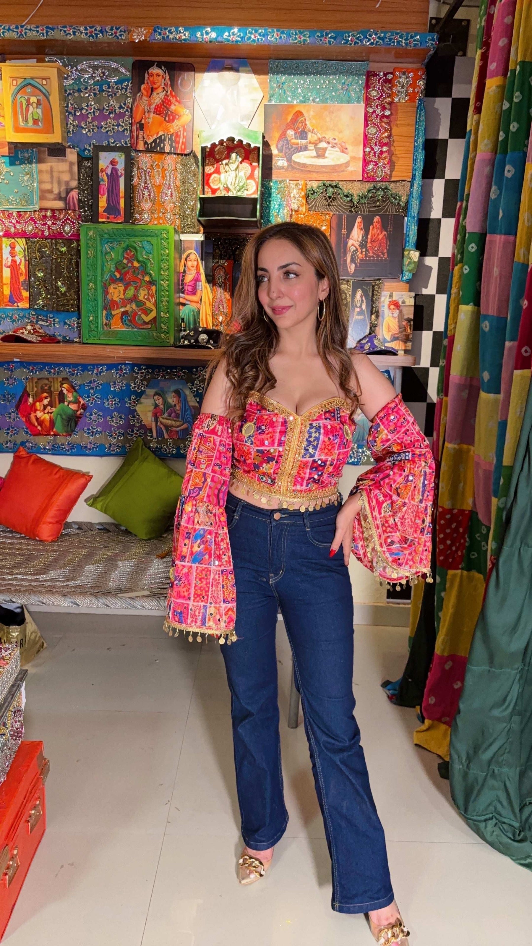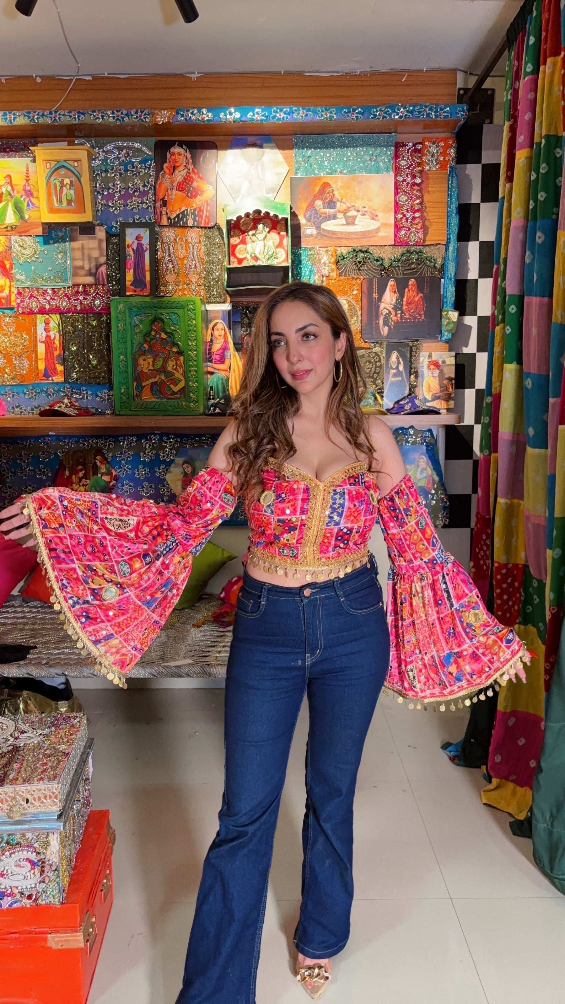 Bustier featuring vibrant traditional patchwork, mirror embellishments, and dramatic attached flared sleeves. Designed in a striking hot pink palette with intricate embroidery and gold lace trims, this Indo-fusion piece blends ethnic elegance with contemporary flair. The gold coin edging adds playful movement and shine, perfect for festive looks or statement styling.