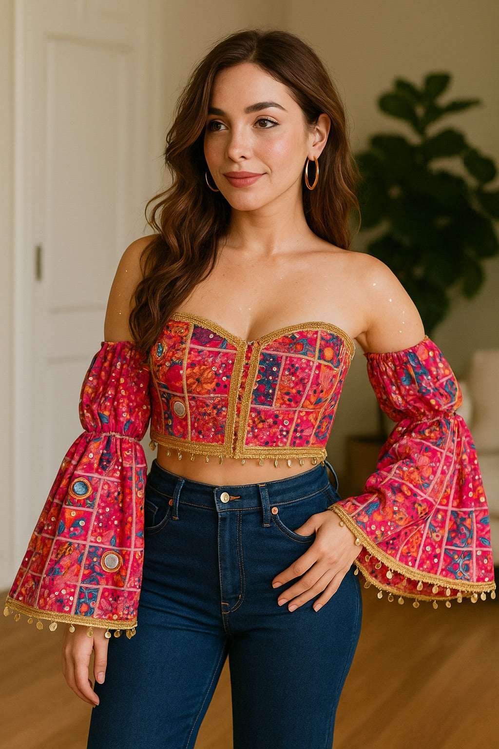Boho Mirrorwork Bustier with Attached Flared Sleeves