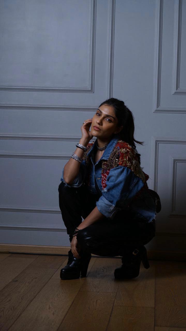 Crafted on a premium denim base, the jacket features hand-embroidered tribal patches enriched with mirror accents and textured detailing. The cropped silhouette and raw hem finish add contemporary sharpness, making it a versatile statement layer.