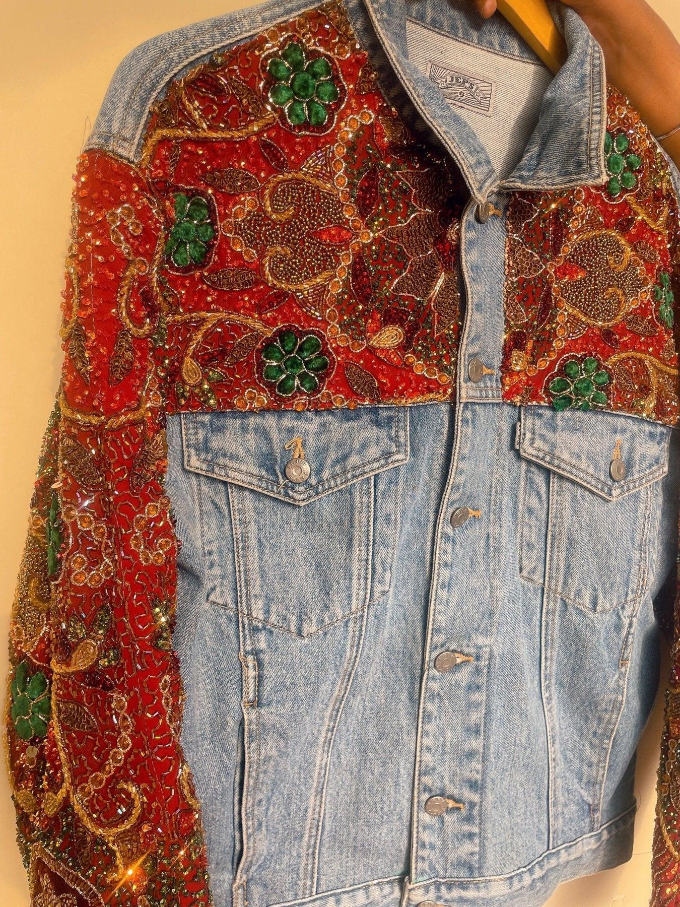 The Teekhi Mirchi Jacket is a powerful celebration of strength and heritage. Crafted on a classic denim base, this statement jacket features heavily embellished sleeves adorned with intricate threadwork, zari detailing, and jewel-toned accents.