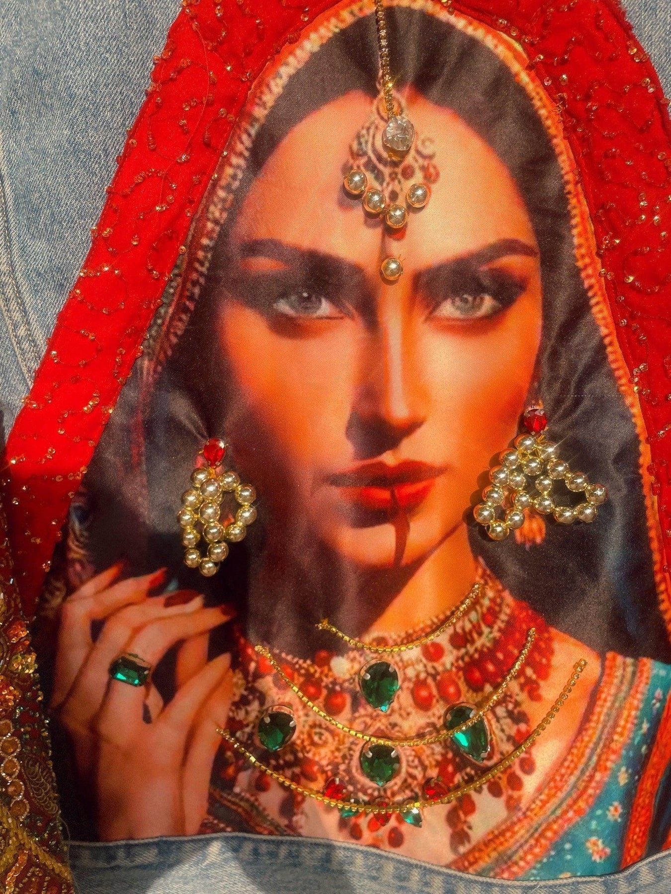 The highlight a striking regal portrait at the back, framed in rich red embroidery, symbolizing bold femininity and royal attitude. The intense gaze, layered heritage jewelry, and dramatic red veil make this piece impossible to ignore.