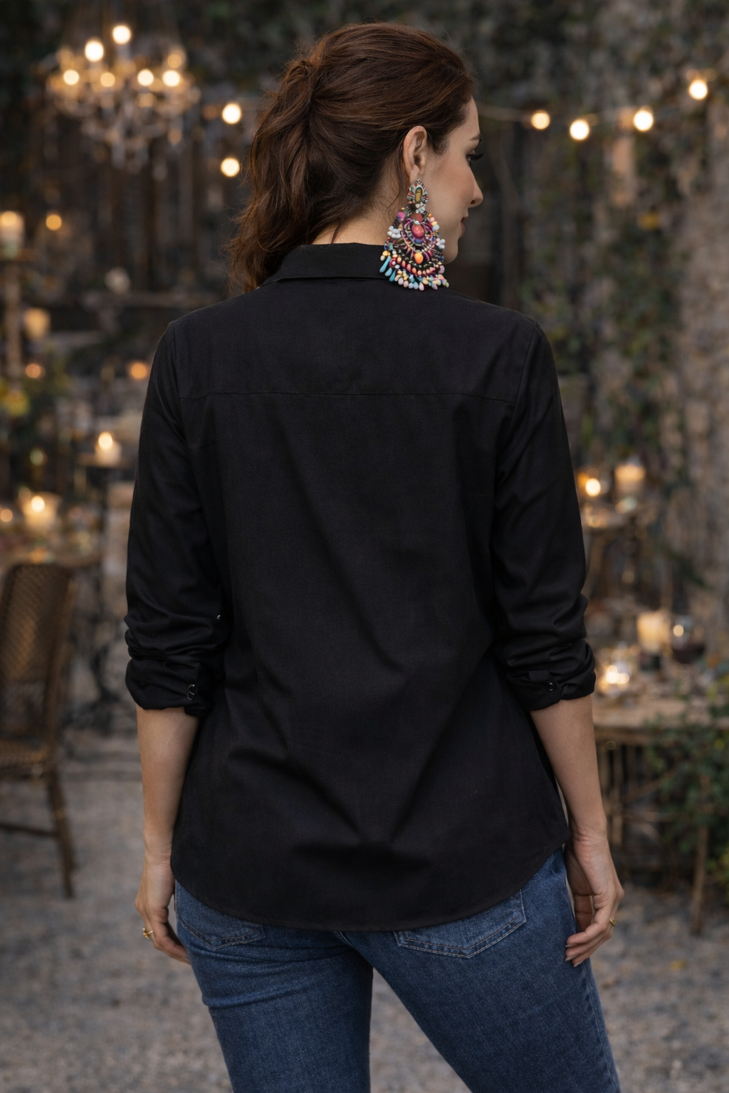 A wardrobe essential with a bold twist. The Black Embellished Shirt blends the elegance of a classic black button-down with a vibrant panel of embroidered and printed patches handcrafted to add colour, character and unmistakable Banjara charm.