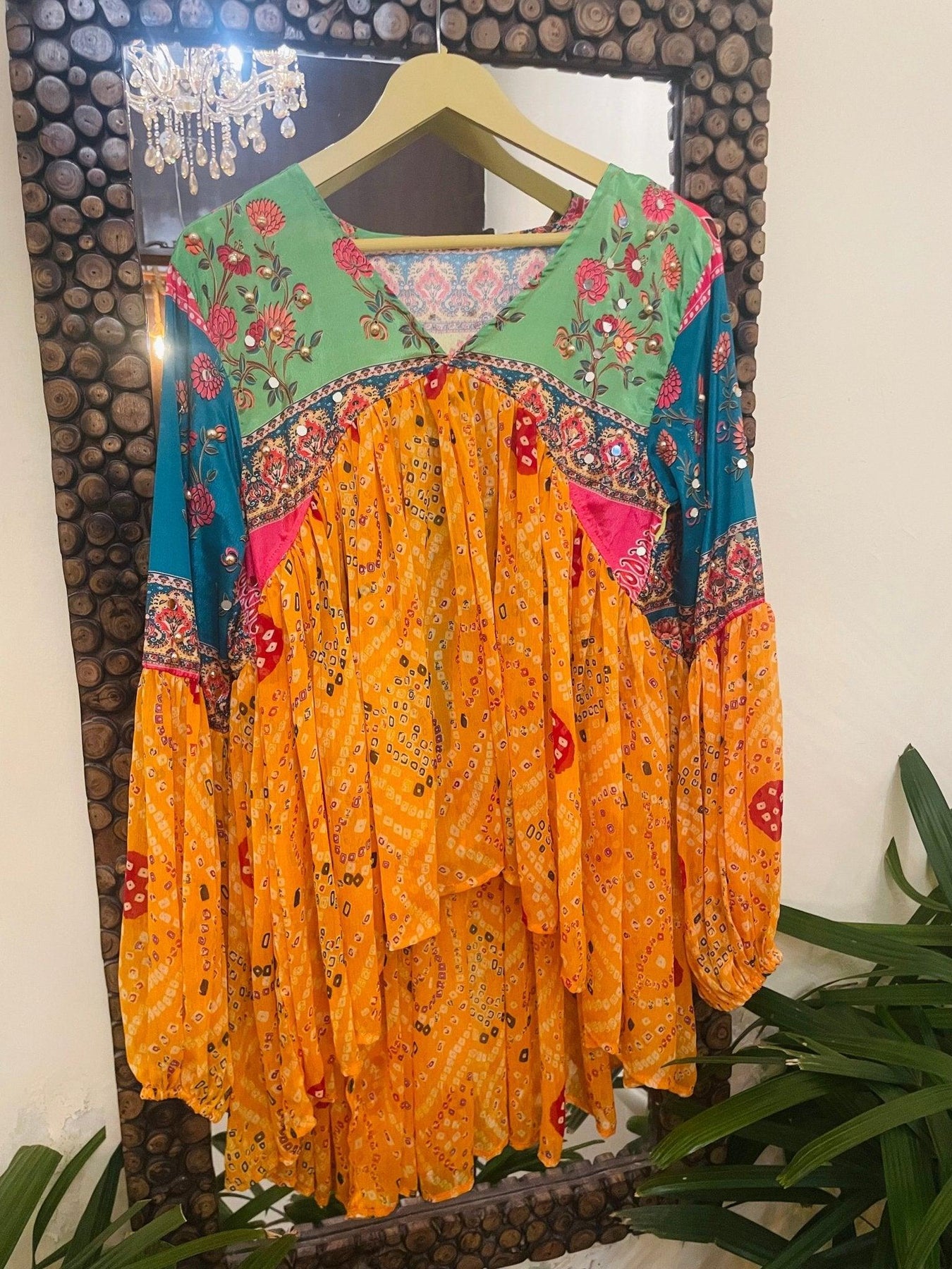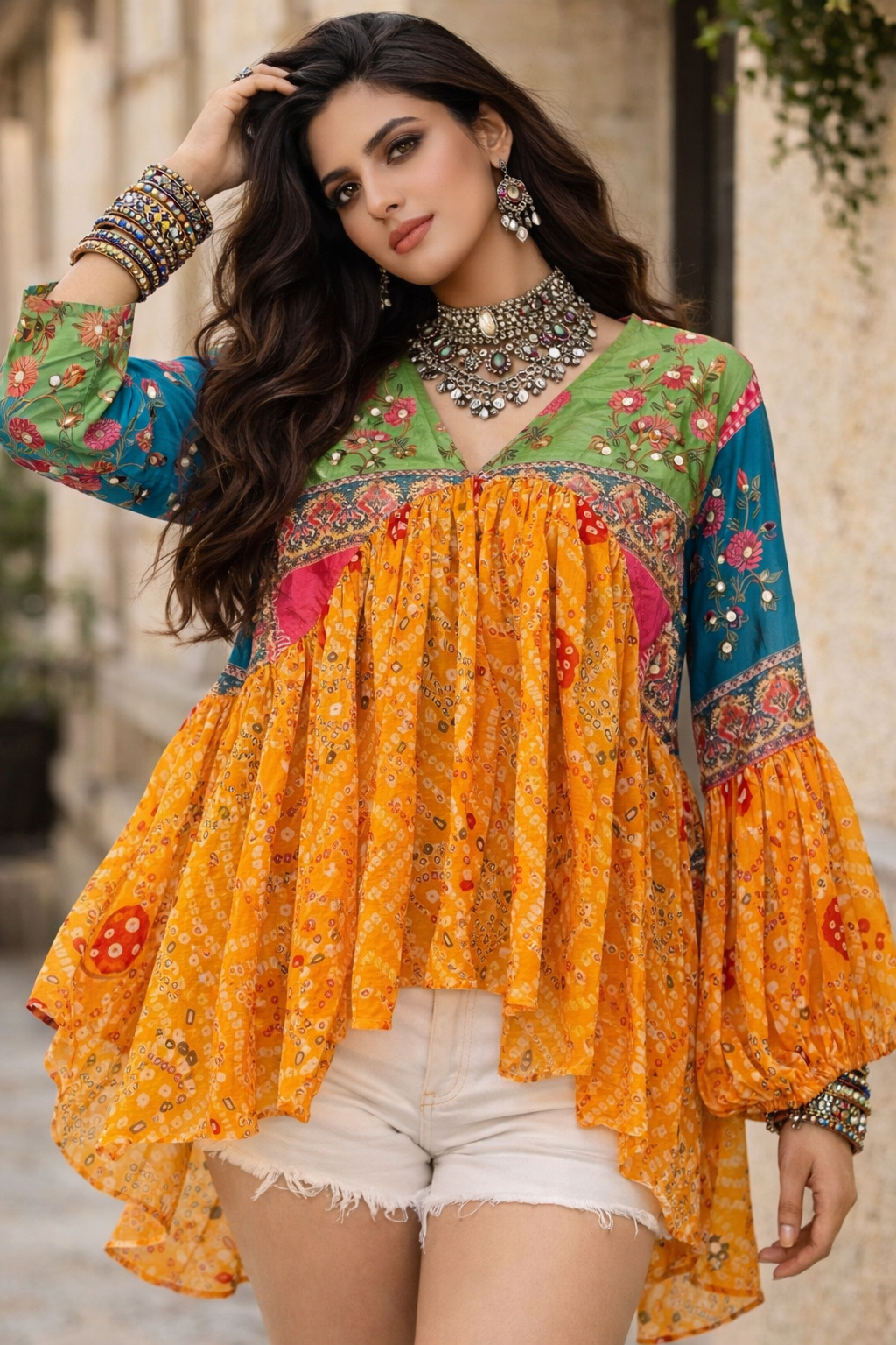 Vibrant, festive, and effortlessly free-spirited, the Garba Grace Fusion Top captures the joyful essence of traditional Indian craft blended with modern bohemian style. Designed with flowing bandhani-inspired prints and intricate floral motifs, this top celebrates color, culture, and movement.