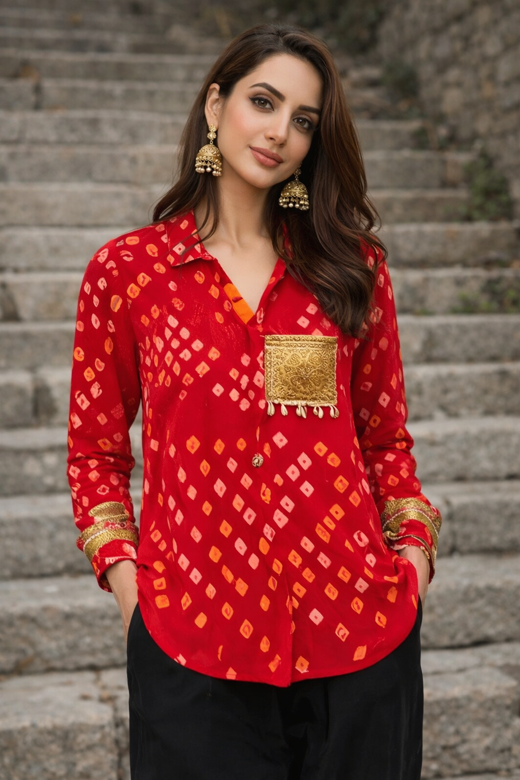 A vibrant celebration of traditional craft and modern elegance, the Red Bandhani Shirt brings timeless artistry into a contemporary silhouette. Crafted in rich red Bandhani fabric, this piece features delicate tie-dye motifs that reflect the heritage textile traditions of Rajasthan and Gujarat.