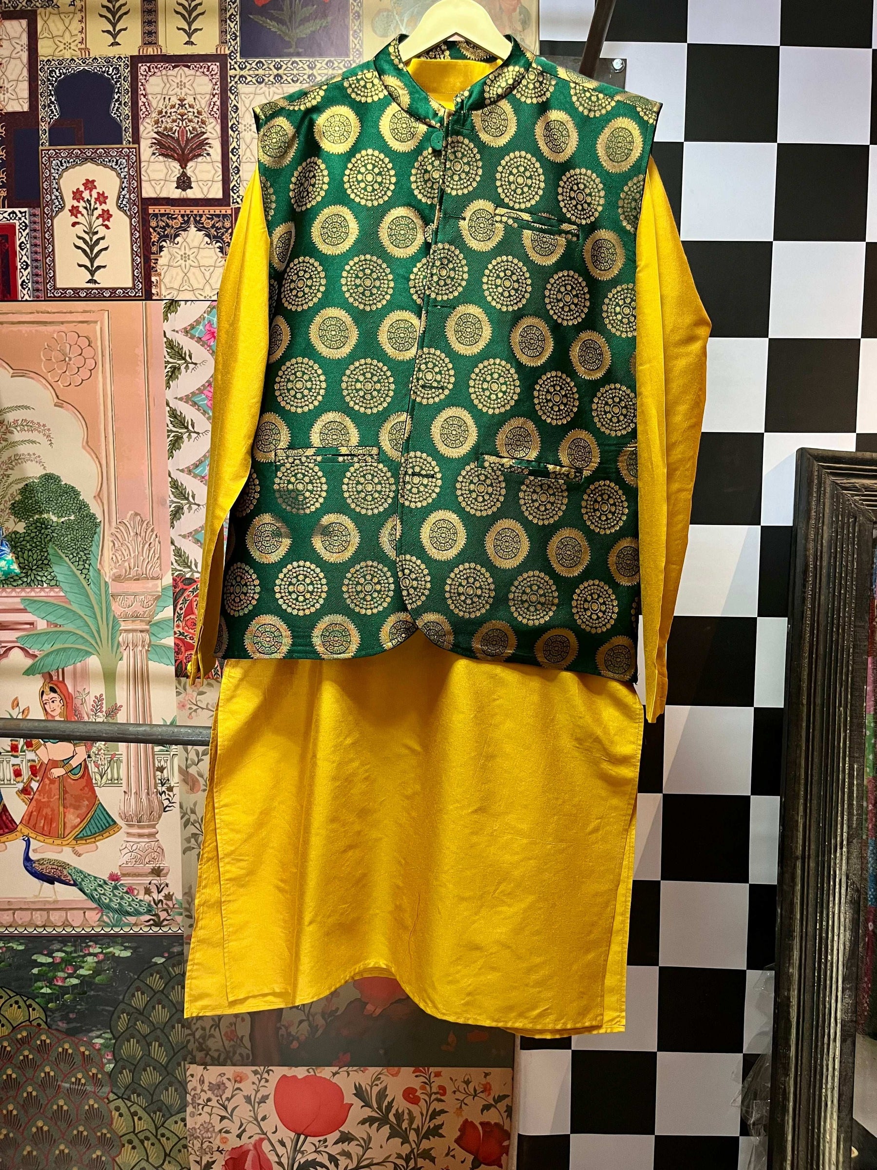 Bottle Green Brocade Nehru Jacket with Mustard Yellow Kurta Set for Men