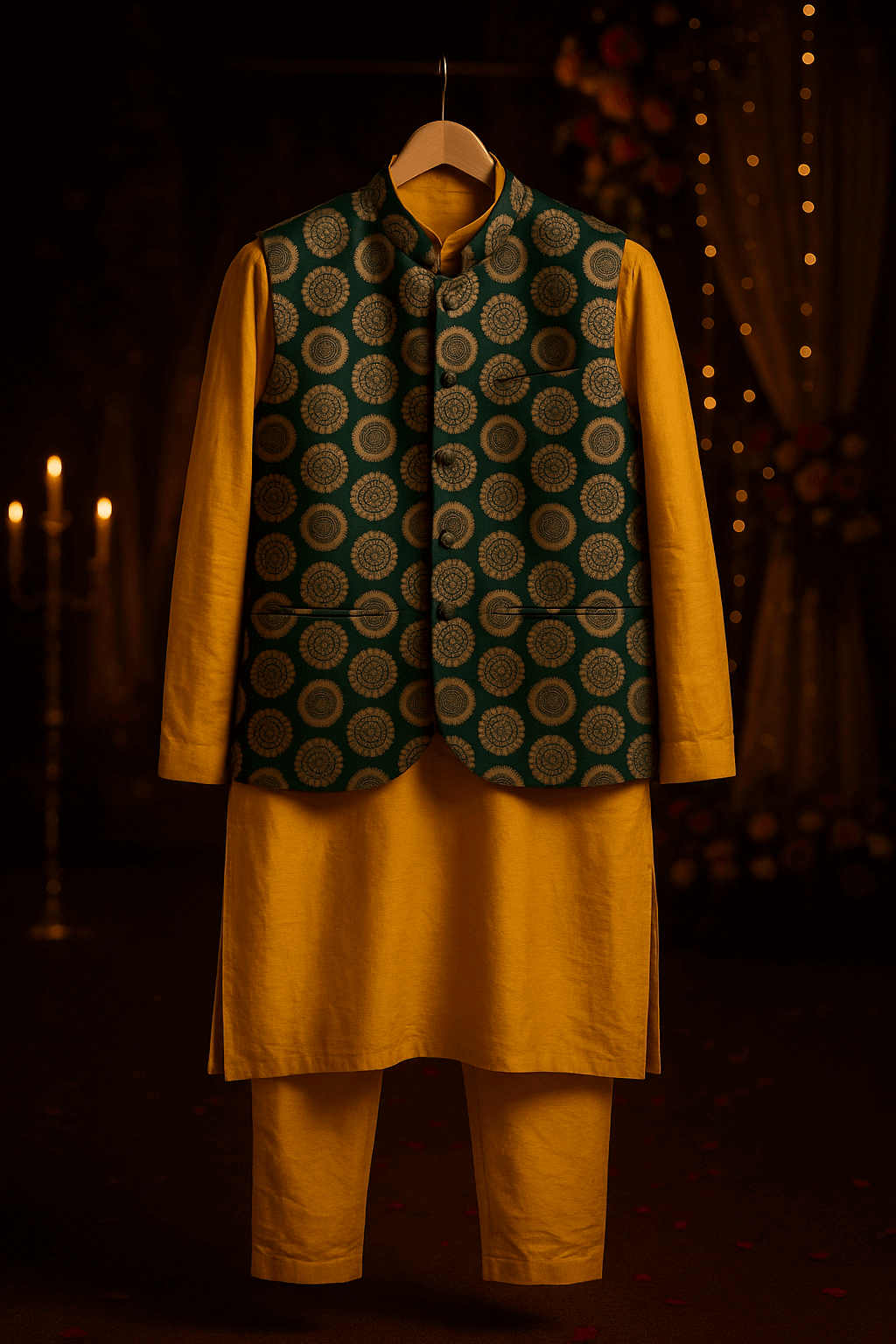 men's festive kurta set, green brocade jacket, mustard kurta pyjama, ethnic wear for men, wedding outfit for men, Nehru jacket kurta combo, Indian traditional wear, haldi ceremony outfit